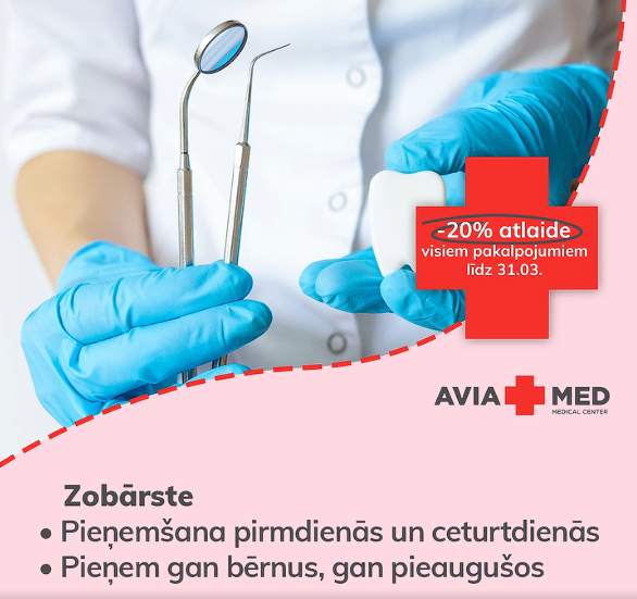 Un līdz 31.03. AVIAMED klīnikā ir pieejama 20% atlaide visiem zobārstniecības un zobu higiēnas pakalpojumiem. Šī ir lieliska iespēja parūpēties par zobu veselību izdevīgāk.