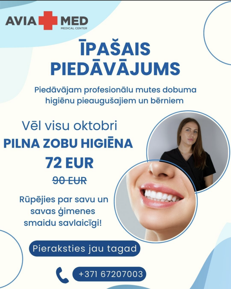 AVIAMED visu oktobri zobu higiēnista pakalpojumiem -20% atlaide. Pilna zobu higiēna, piena zobu